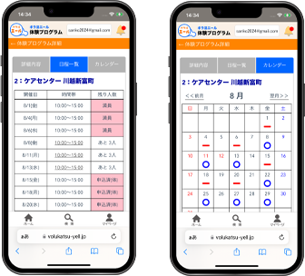 開催日一覧とカレンダー表示で一目でわかる予約状況と簡単申込を実現。