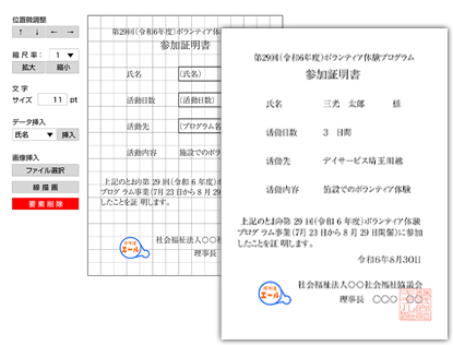 自由なレイアウト(テンプレート)、体験者毎、体験プログラム毎のダウンロードに対応した証明書作成機能です。